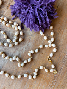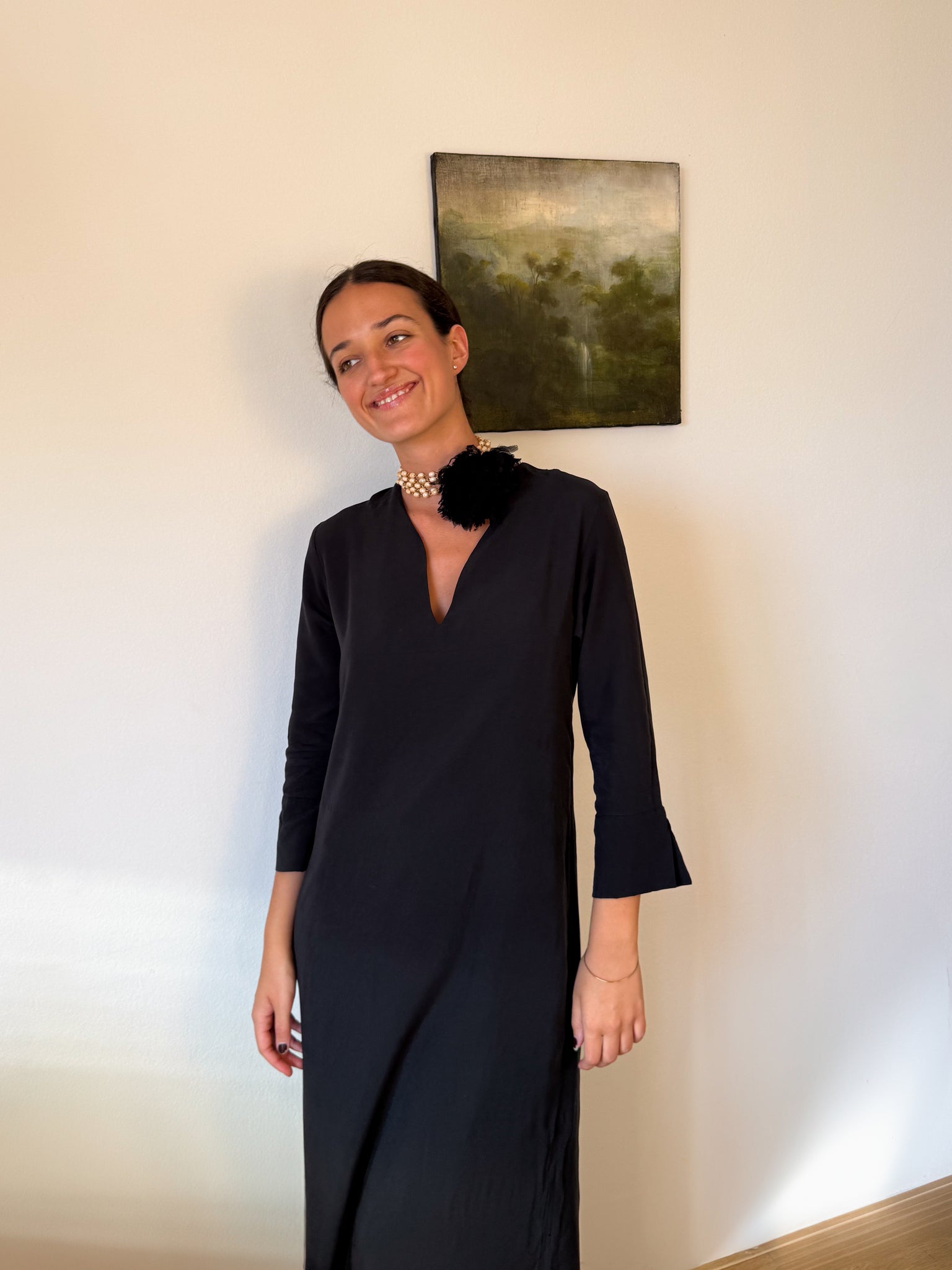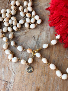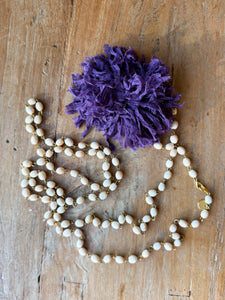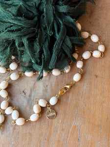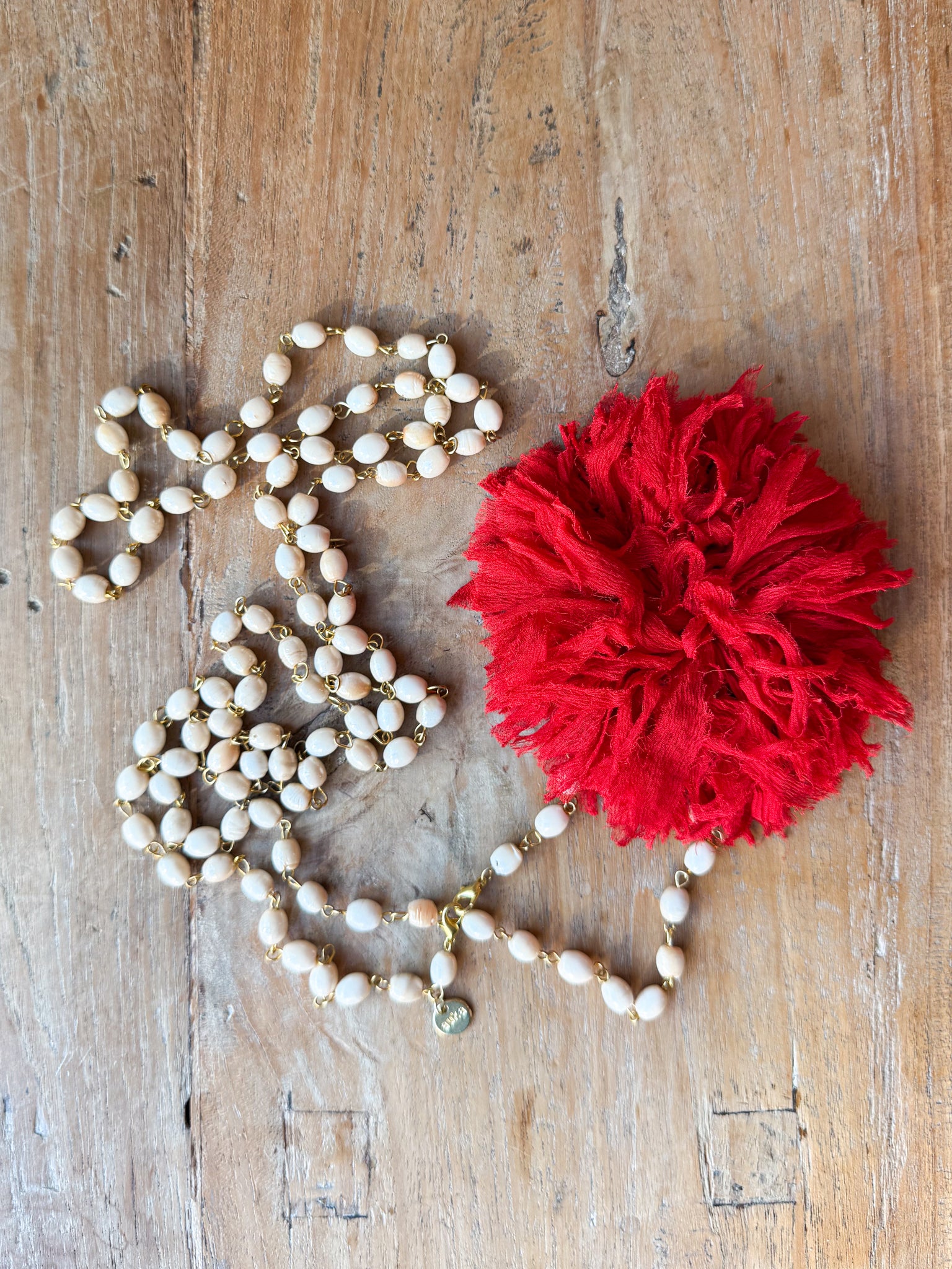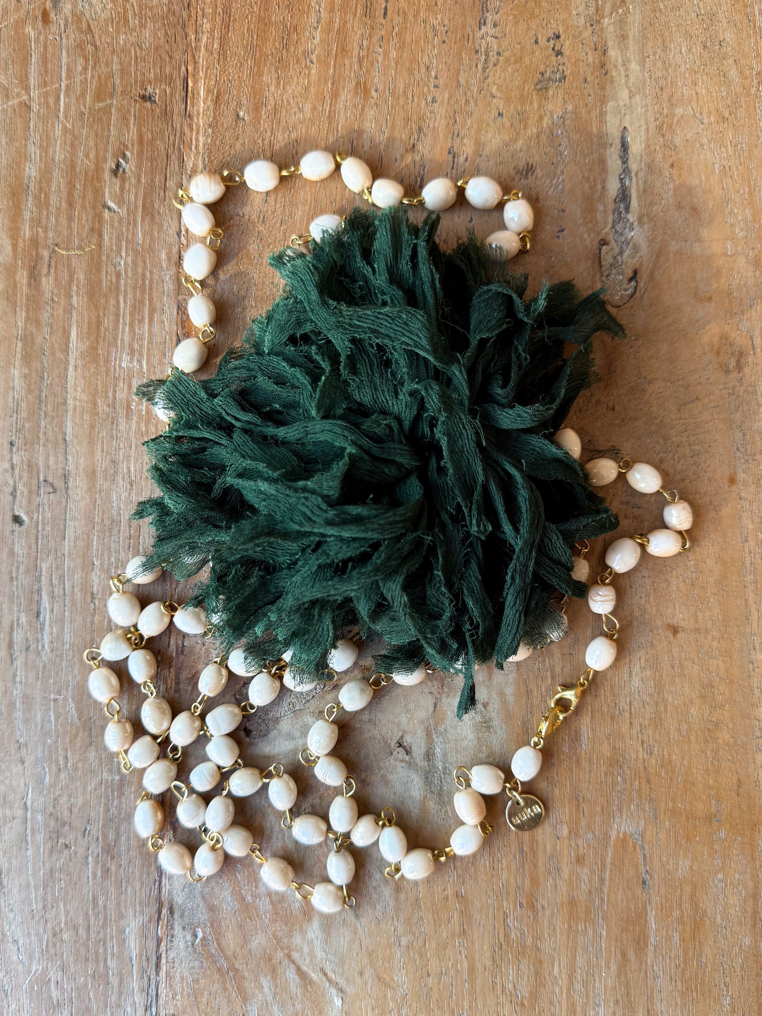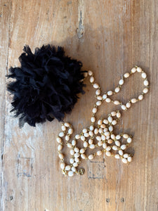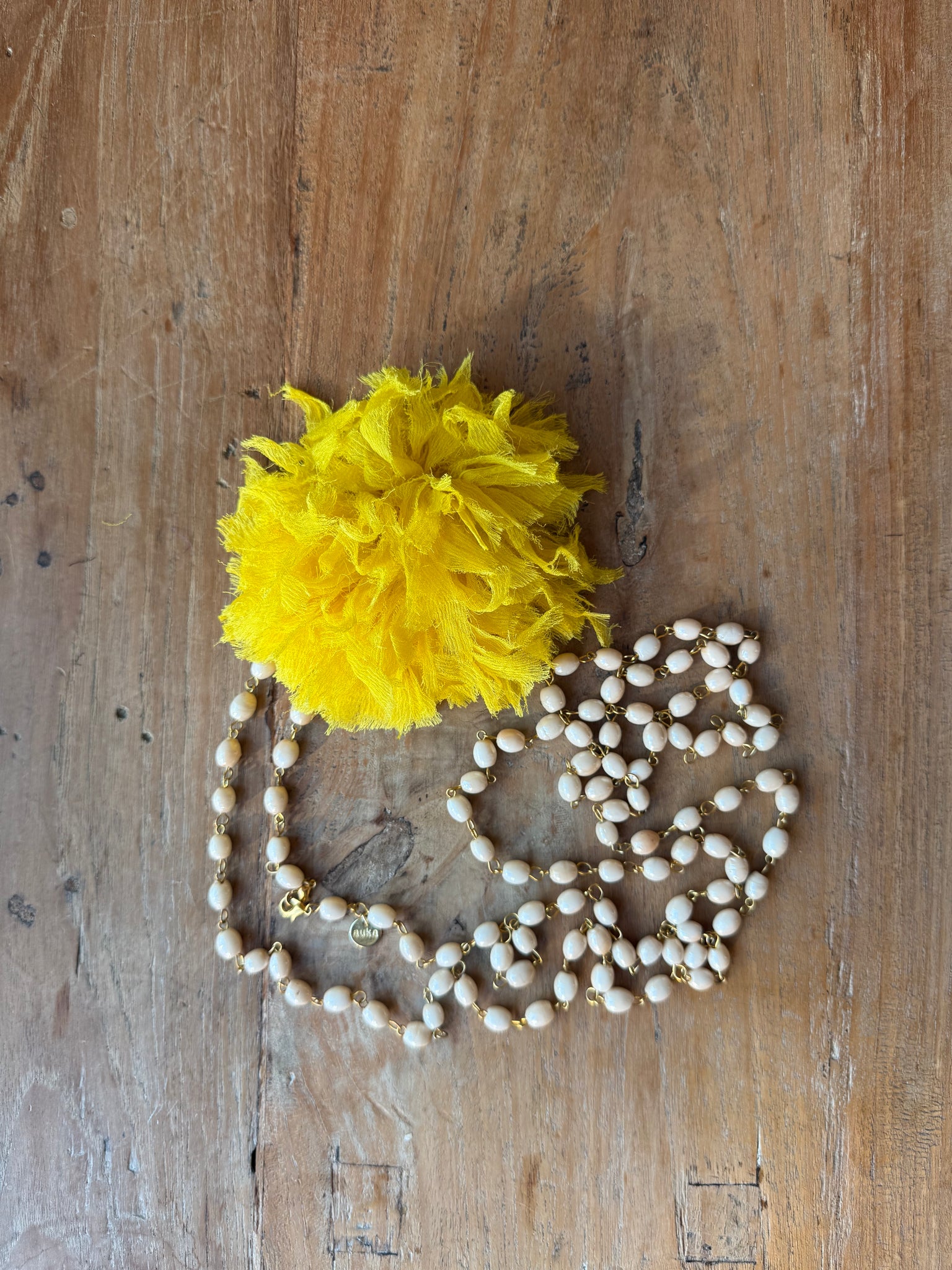 Our most iconic necklace in motion! One of our first pieces is back: the pearl-effect glass bead necklace with a chiffon flower!The flower comes in six colors: yellow, red, purple, green, navy, and black!You can wear it in a thousand ways. It was our best-selling piece for years, and we're happy to have it back!